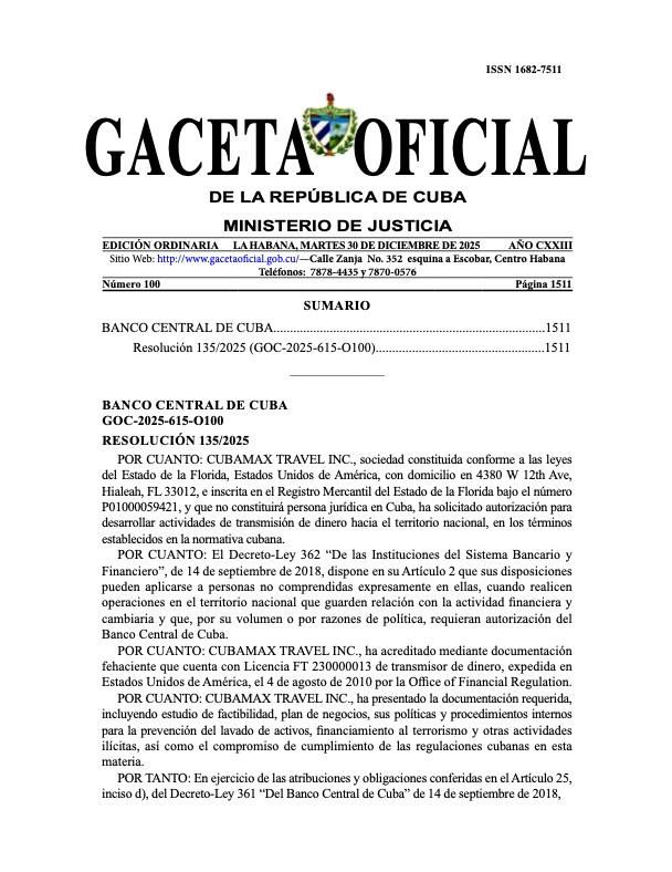 La Resolución 135/2025 faculta a Cubamax para "desarrollar actividades de transmisión de dinero hacia el territorio nacional". La entidad podrá también "canalizar fondos, a través de instituciones financieras cubanas, para depósito en cuentas, tarjetas de débito, o carga de tarjetas prepago de beneficiarios en Cuba".